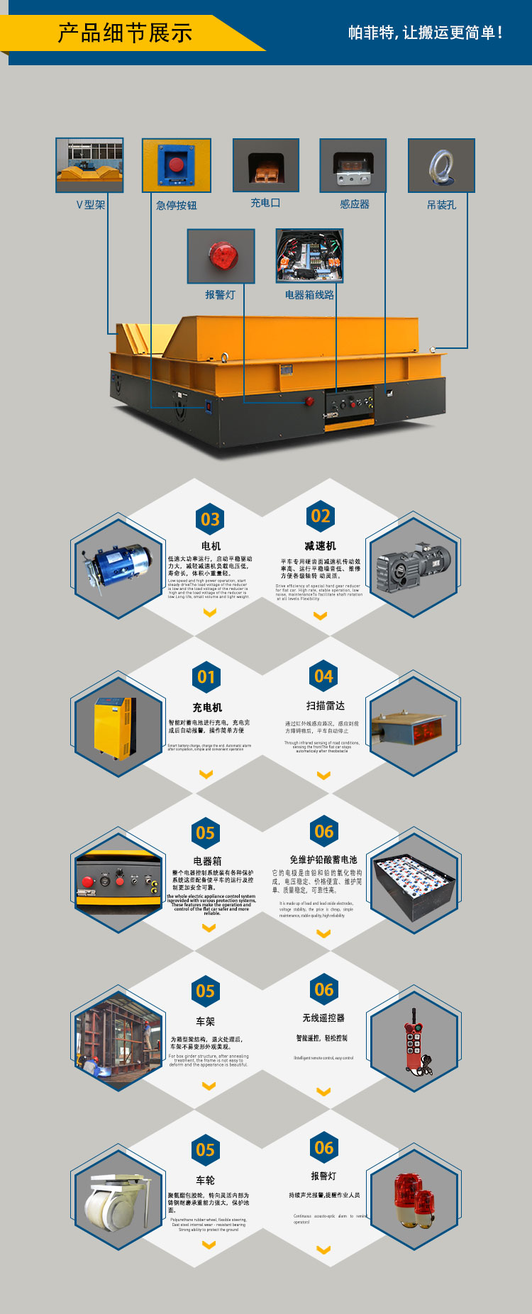 1、載重運(yùn)輸:BWP系列電動(dòng)平車(chē)是專(zhuān)為運(yùn)輸設(shè)計(jì)的產(chǎn)品,故首要功能為運(yùn)輸;